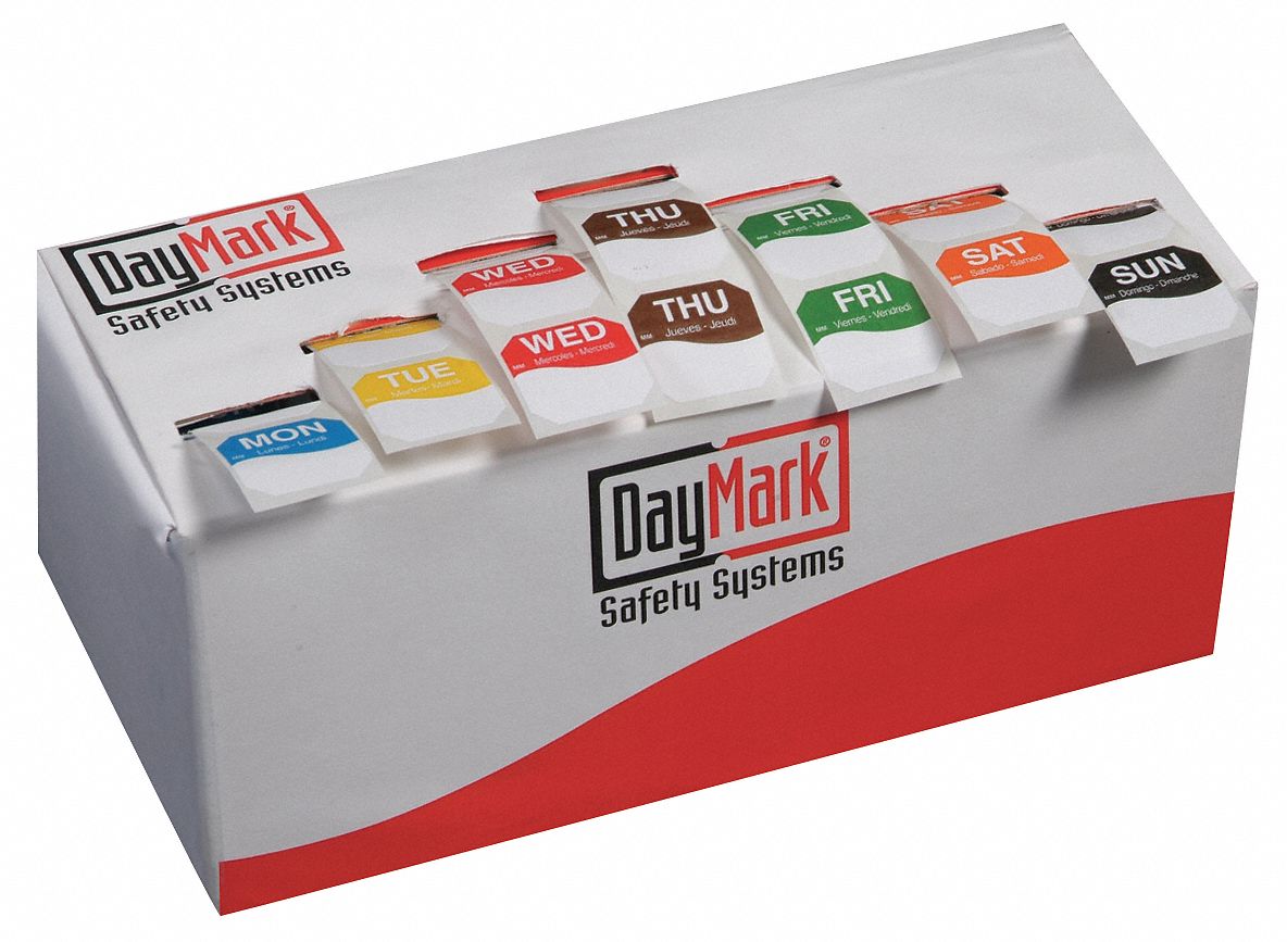 DayMark Safety Systems-IT1143925 Day of the Week 3/4" Circle Permanent ... 396 ratings Product description DayMark DuraMark 3/4 inch trilingual Label is moisture-resistant permanent. The day of the week is printed on the Label in English, Spanish, and French. DayMark day of the week labels are color-coded by day for easy identification. The label's adhesive backing affixes to a clean surface. DuraMark™ Deli Labels - DayMark Safety Great for plastic bags and corrugated containers, deli labels can be used to communicate important food information and prevent cross contamination. DuraMark deli and food labels feature a permanent adhesive that will hold up in temperatures of -40° F to 160° F. Great For: plastic bags, corrugated containers, and freezer foods. Amazon.com: DayMark Safety Systems-IT114658 Date Coder Permanent Label ... Visit the DayMark Safety Systems Store 4 ratings Price: $11.18 ($1.40 / Roll of Labels) About this item Aggressive adhesive capable of permanently adhering to any surface Cost-effective for labeling throw-away containers Adheres in temperatures ranging from -40 to 160 degrees F; freezer safe