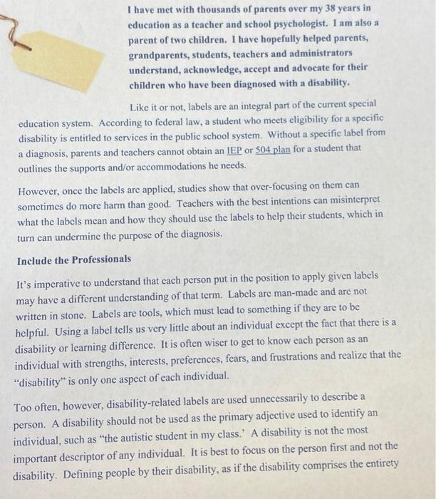 Pros & Cons of Labeling in Special Education - Study.com Jan 12, 2022 ... In special education, labeling classifies students based on their needs and assigns resources for their category. Explore the types of ... Labelling in Special Education. (Advantages and Disadvantages) Jul 2, 2015 ... Persons with disabilities are ladled based on their medical and educational diagnosis, for example cripple which is used to refer to a person(s) ... Labeling in Special Education - Special Ed Resource Disability Labeling. Children that have learning disabilities or special needs used to be denied the privilege of a standard education, as there were no ...